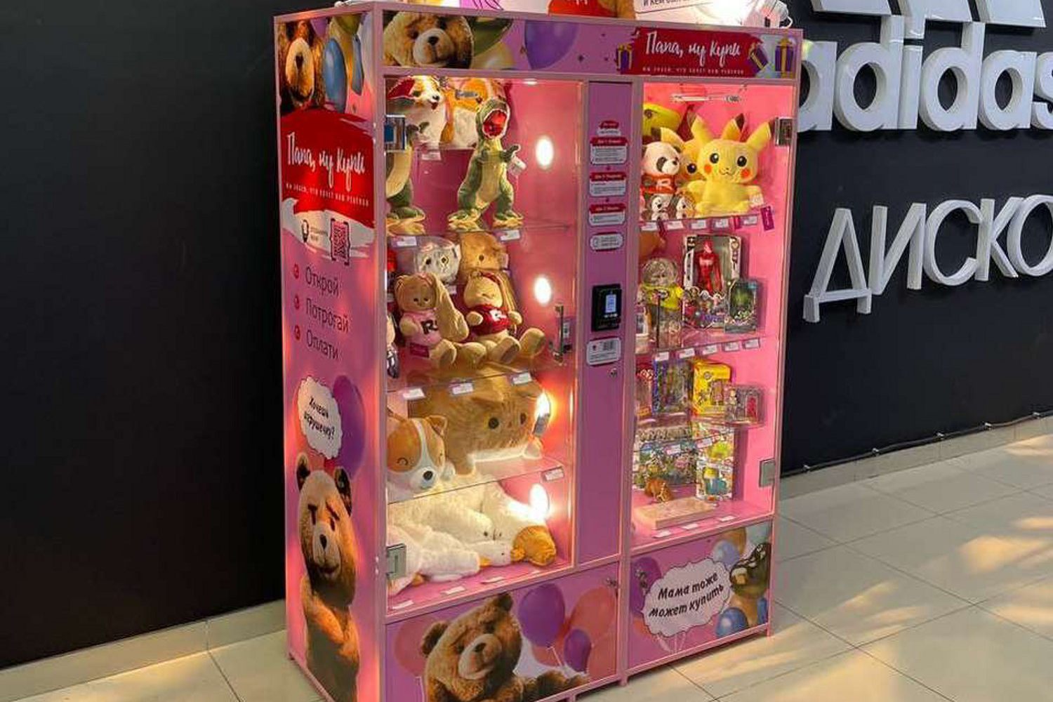 Компания занимается продажей игрушек, необходимо проработать новый стиль компании вендинговых аппаратов по продаже игрушек "папа ну купи" Размещение полок оставить как есть