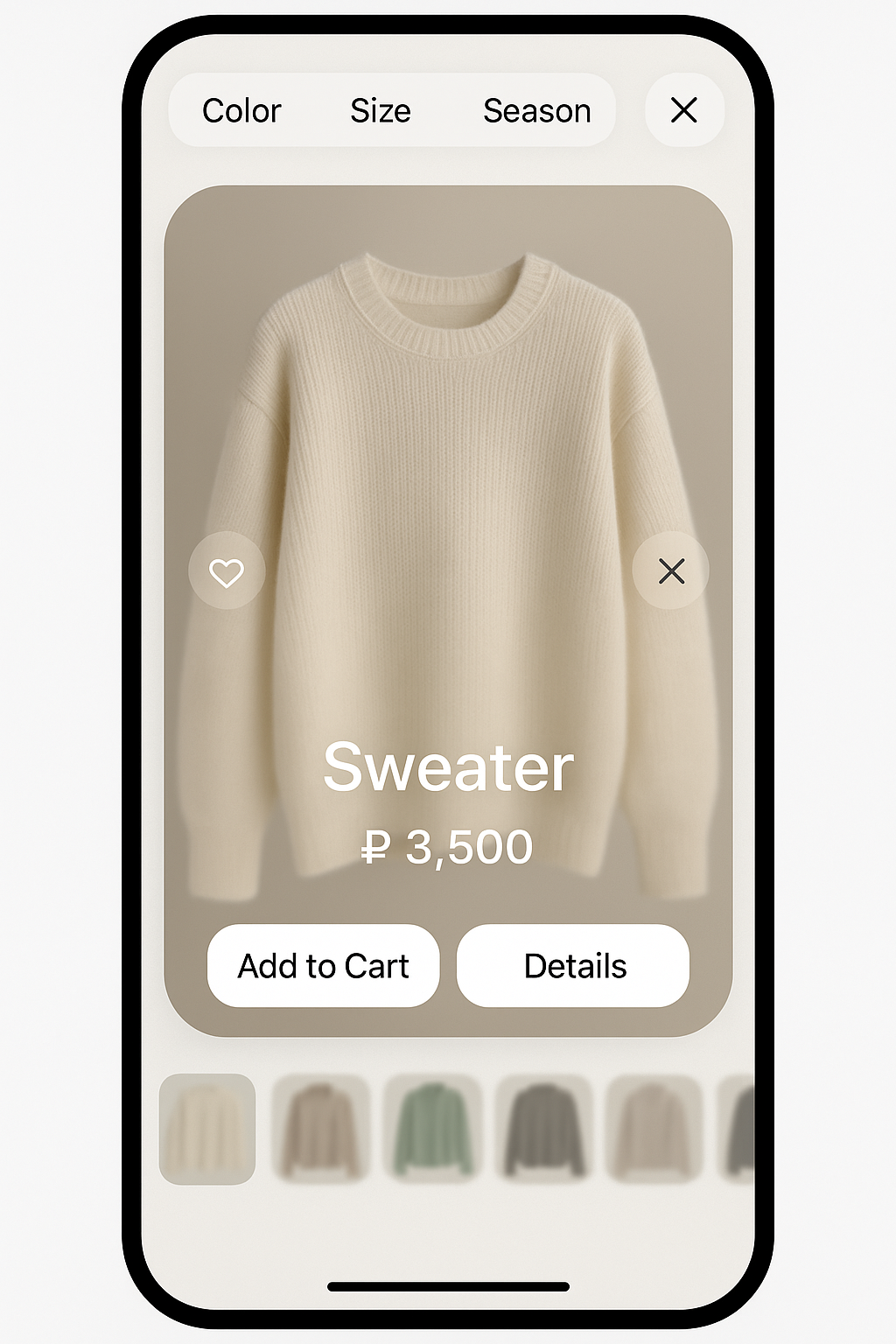 - Под зоной свайпа отображается горизонтальная лента мини-превью товаров по активным фильтрам (скролл).