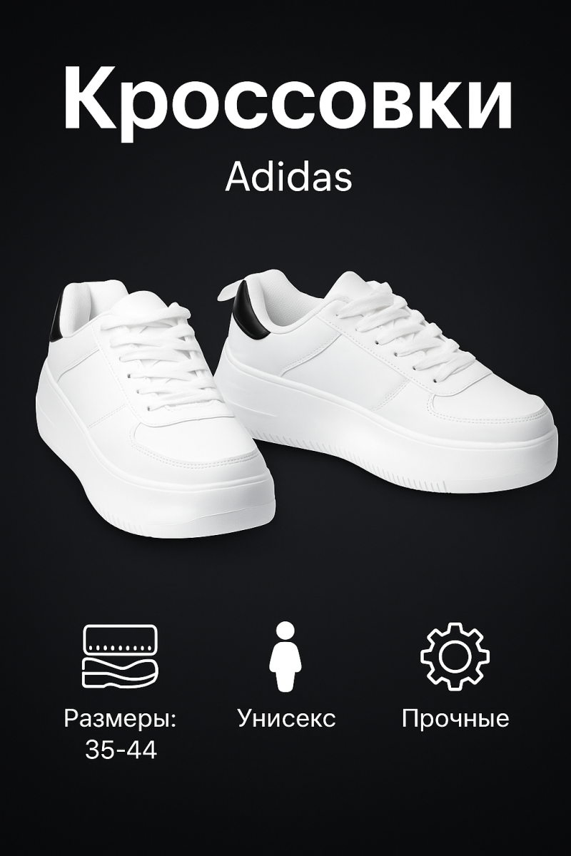 Карточка товара кроссовки Adidas размера 35-44 в стиле минимализм.