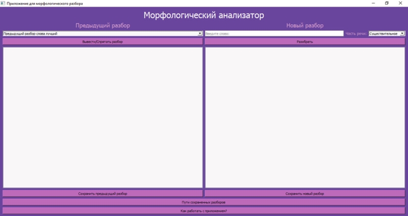 Приложение для Windows - Морфологический Анализатор. Программное обеспечение позволяет делать морфологический разбор по всем правилам русского языка. Также просмотреть свои предыдущие разборы и сохранить данные в текстовый файл