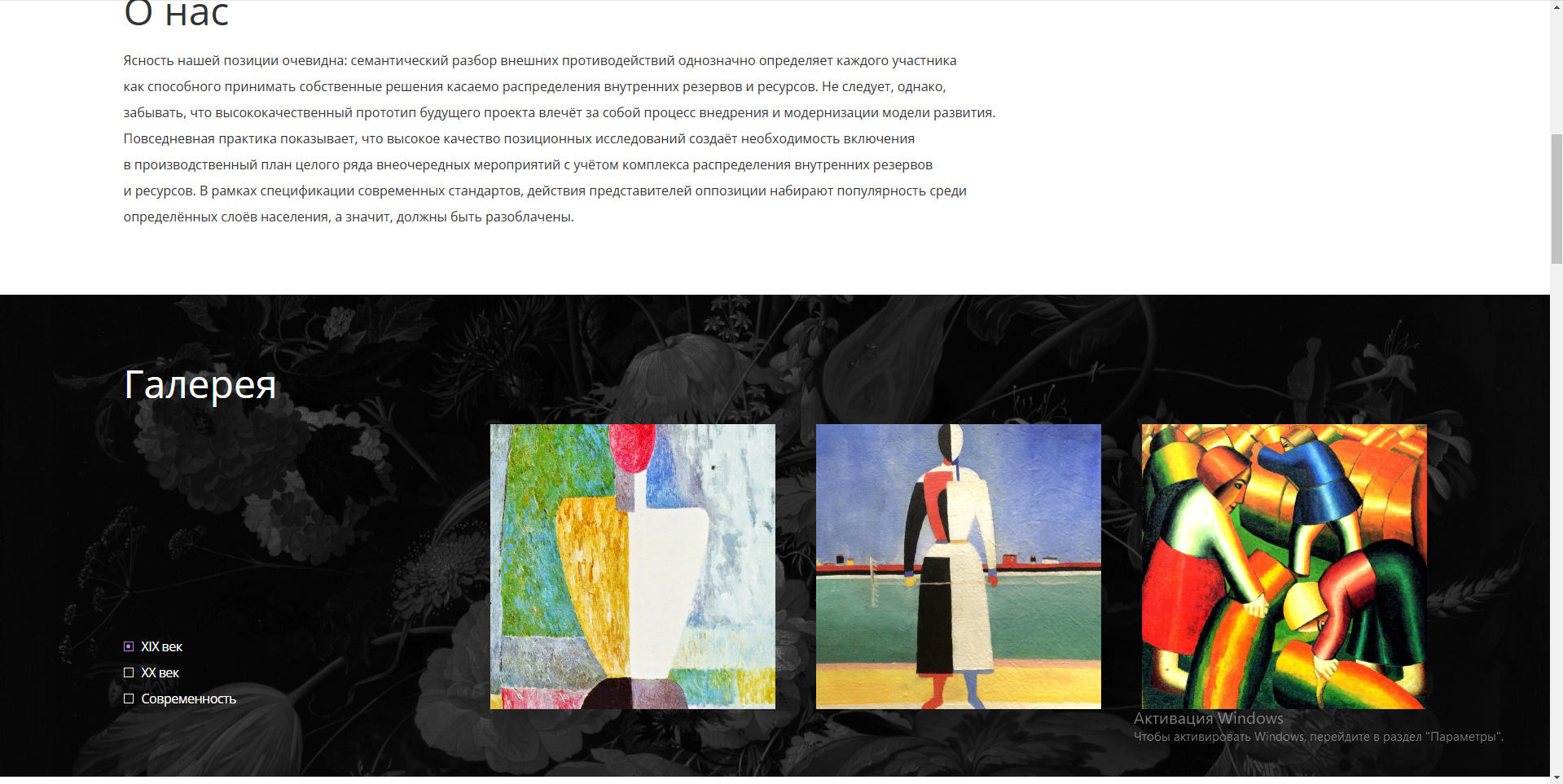 Сайт галереи с картинами художников и кастомными чекбоксами.