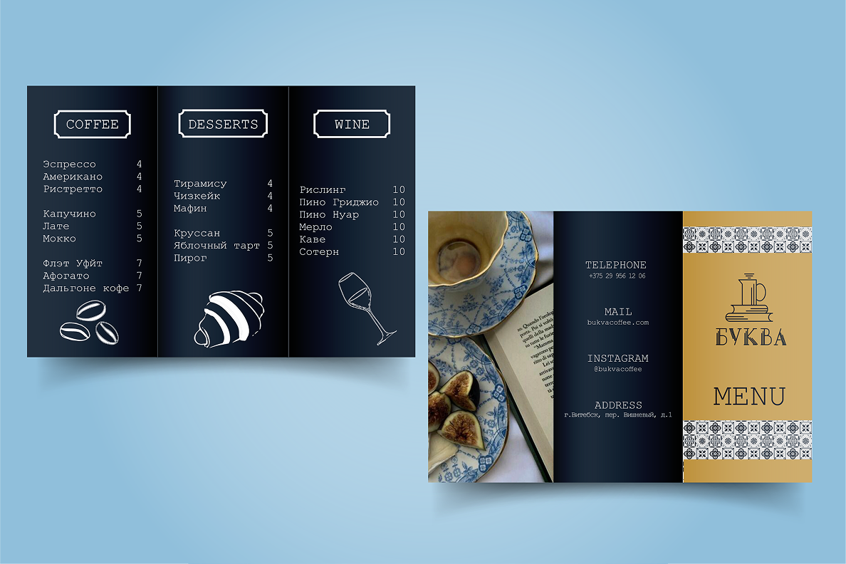 Цветовая палитра, графические элементы и оформление помогают создать целостный фирменный стиль, где текст и визуальная среда работают в едином ритме, а каждая деталь передаёт философию кофейни "Буква".