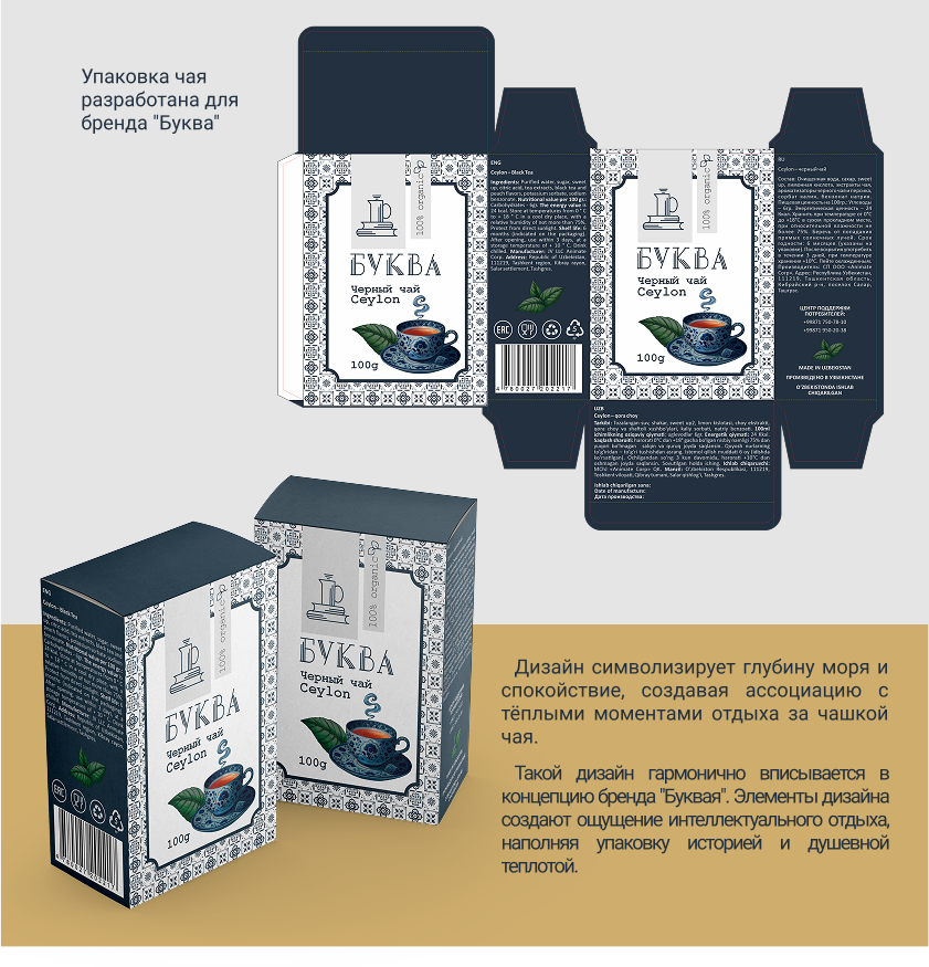 Кроме того, я создала упаковку для чая, выдержанную в песочных и голубых оттенках, передающих тепло и лёгкость словно морской бриз, пролетающий над страницами книги. Дизайн упаковки поддерживает общую концепцию бренда, усиливая его уютную и эстетическую атмосферу.