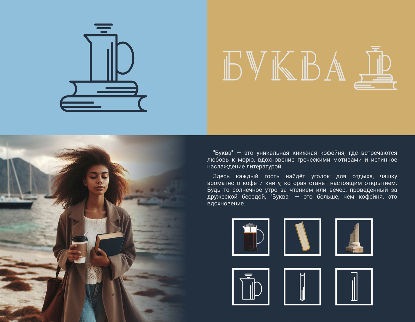 Я разработала фирменный стиль для "Буквы", объединив две ключевые идеи любовь к чтению и морскую атмосферу. Визуальная концепция передаёт ощущение спокойствия, уюта и вдохновения, создавая пространство, где хочется погружаться в книги и наслаждаться ароматным кофе.