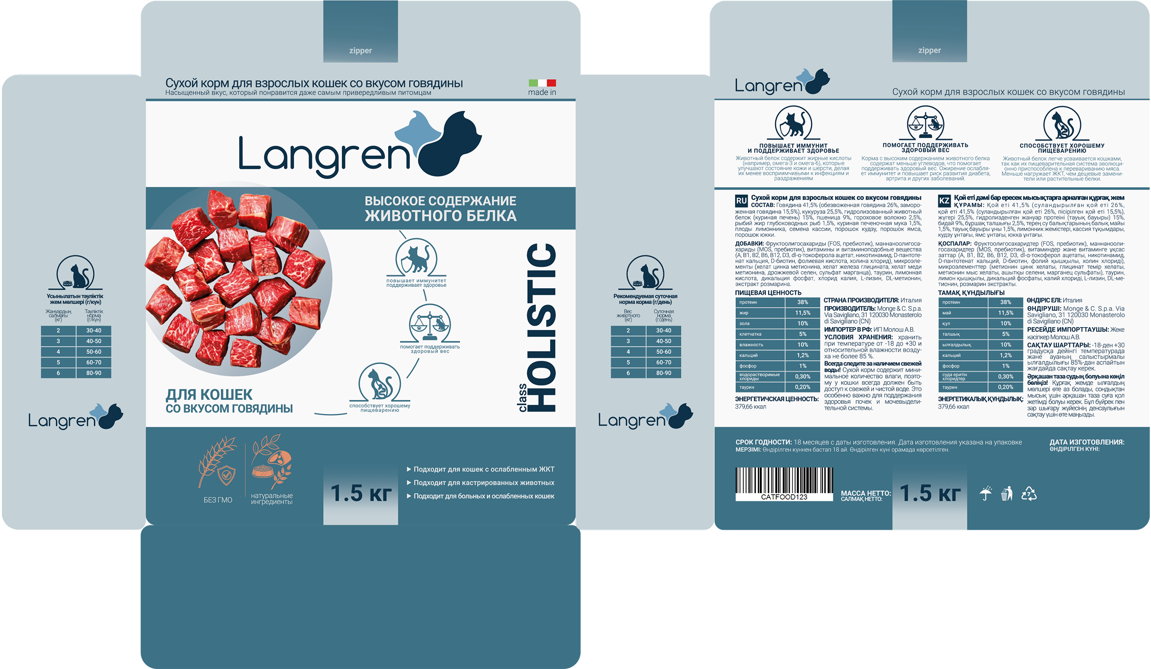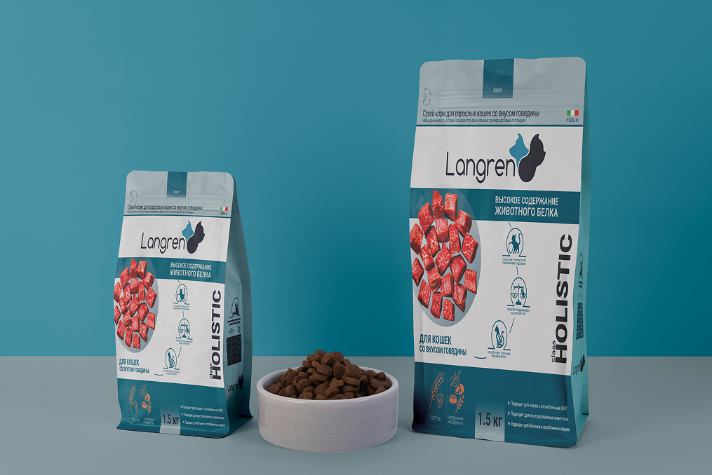 Оформление упаковки строится на лаконичных и чистых визуальных элементах, подчёркивающих экспертность бренда и научно обоснованный подход к кормлению. Цветовая палитра и графика тщательно подобраны, чтобы ассоциироваться с качеством и внимательностью к благополучию питомцев.