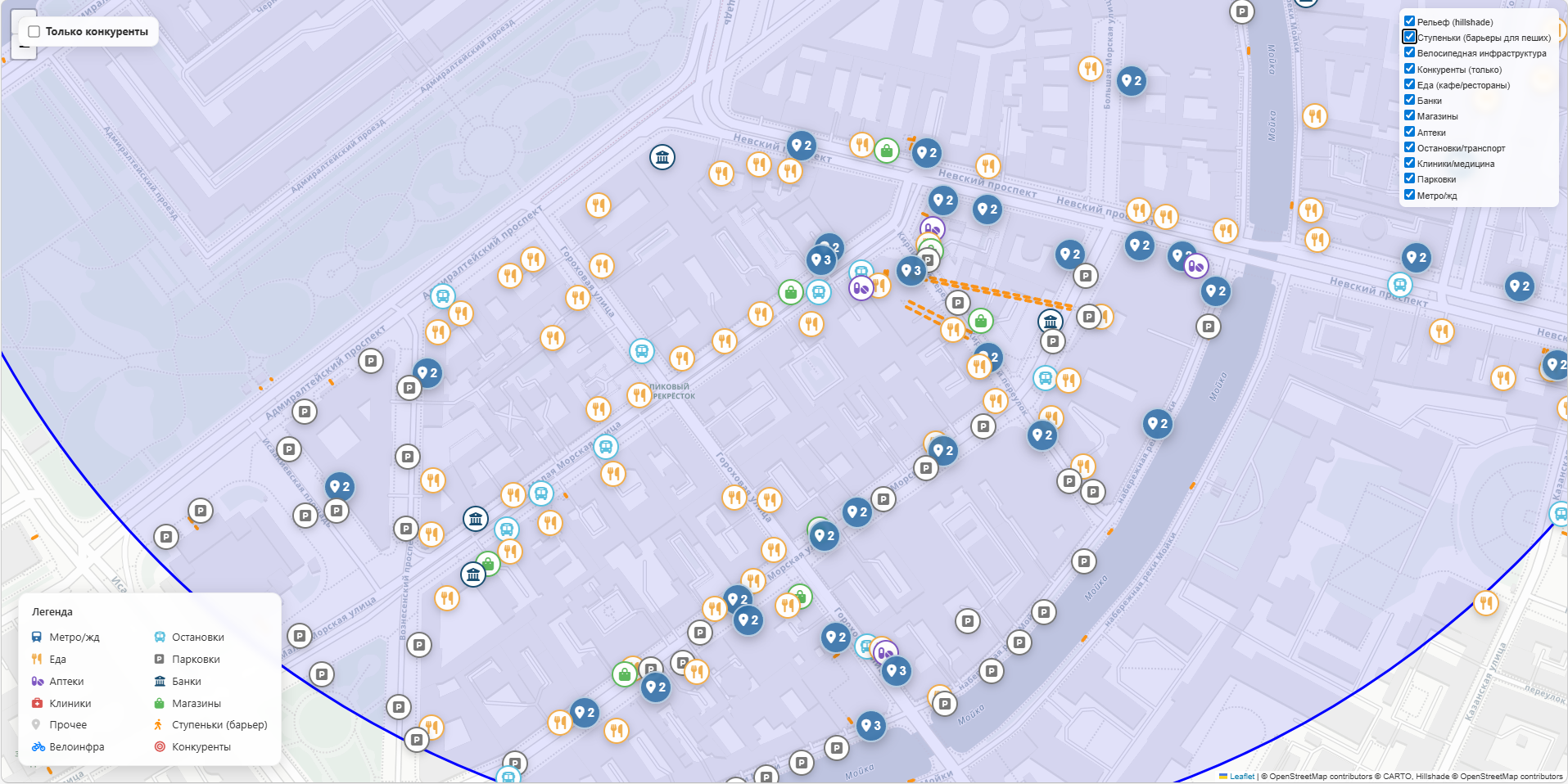 Объективная картина наглядно видите пешеходный трафик, транспортную доступность, парковки и конкурентов в радиусе 700 м.