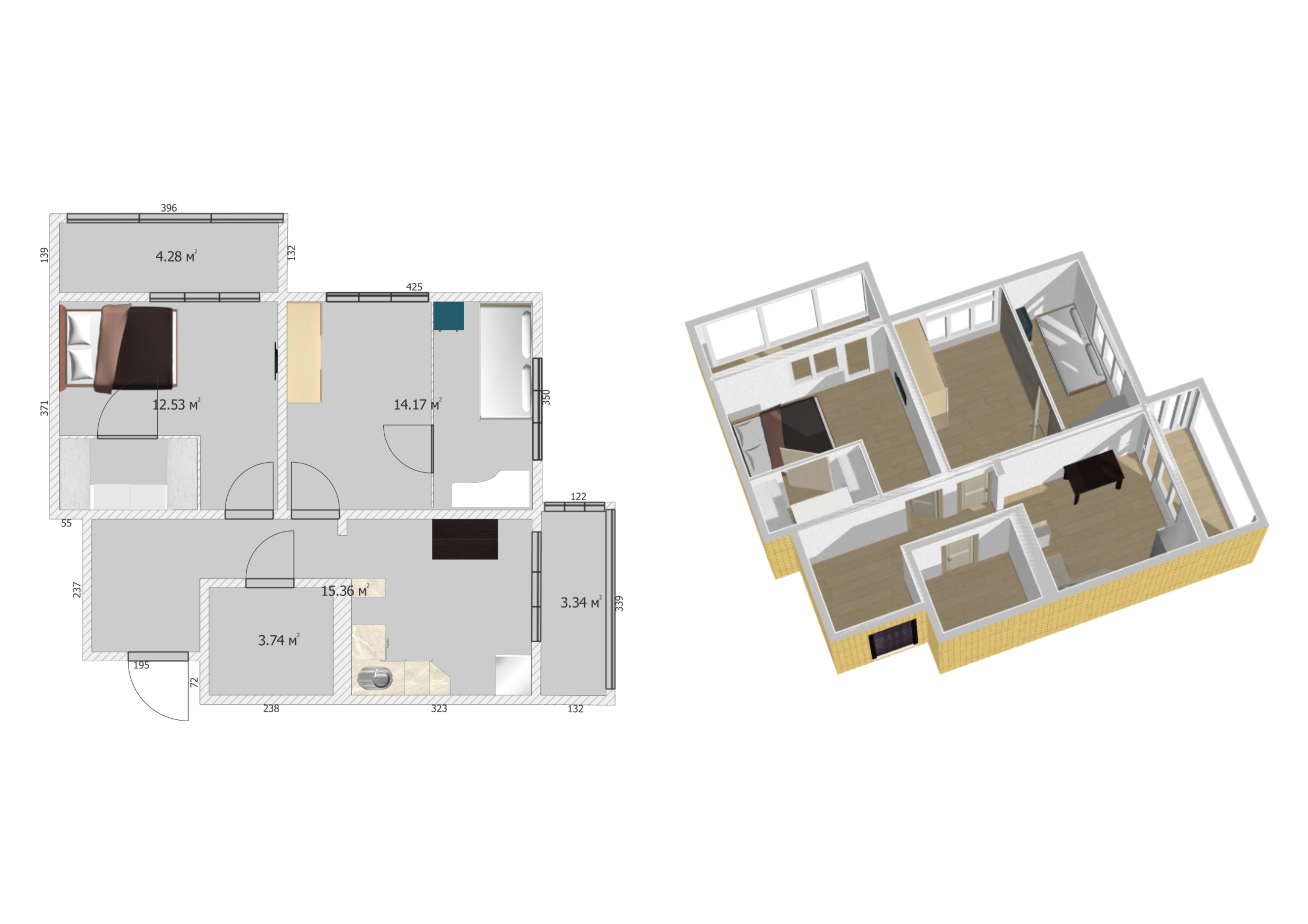 2д и 3д проект квартиры.И мебели которая есть по размерам.