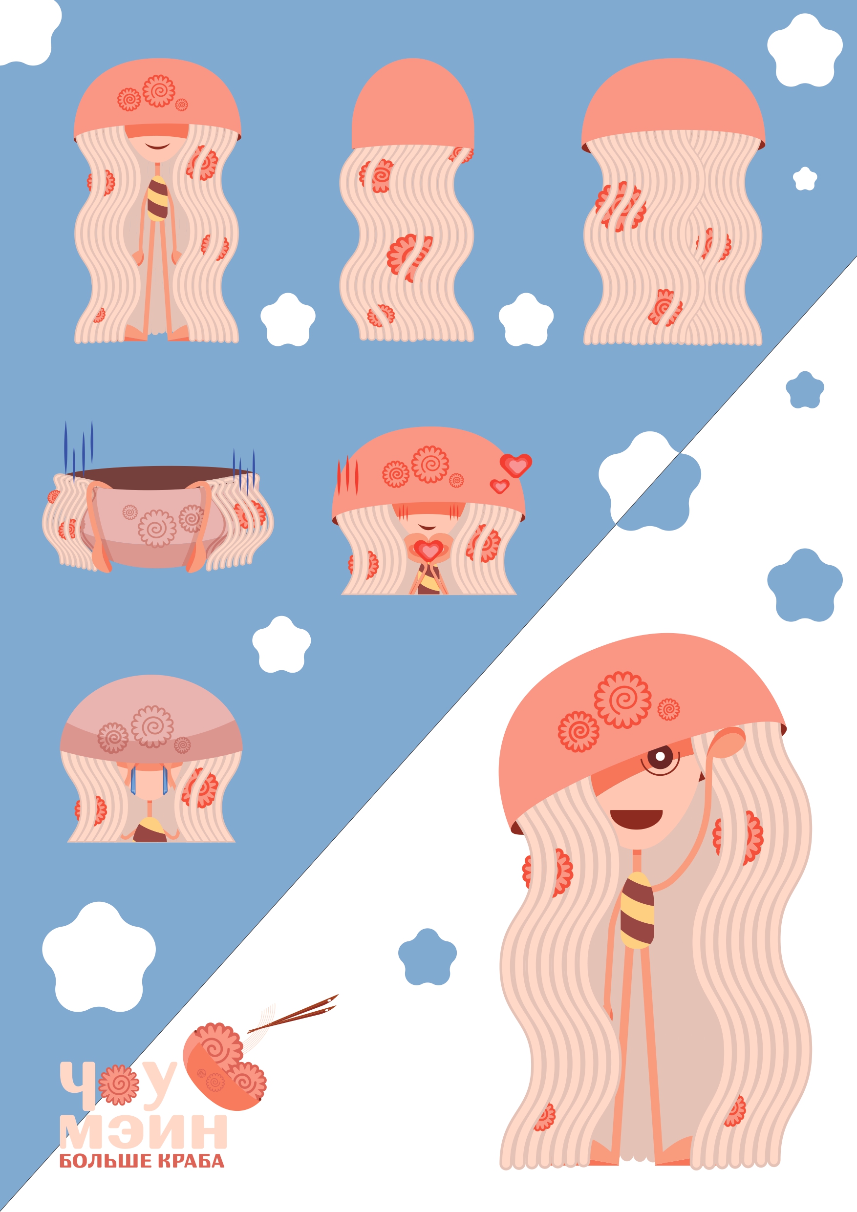 Данный маскот - это девочка с тарелкой на голове, вместо волос лапша. Такой дизайн маскота подчеркивает данный ресторанчик-лапшичную, что выделяет ресторан. А также 2 рекламных плаката