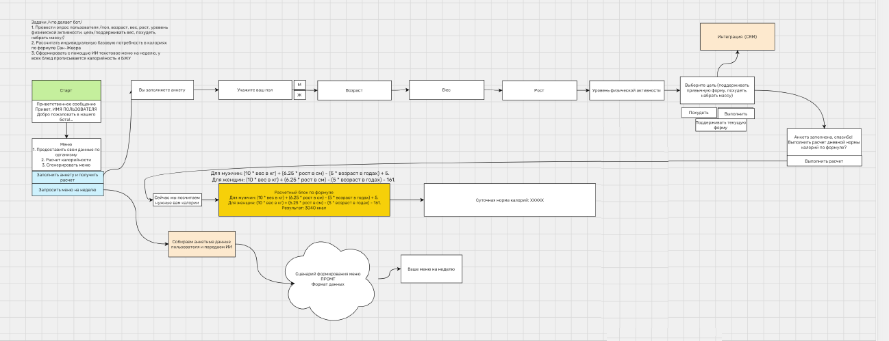 Бот в telegram на основе вводимых пользователем данных (пол, вес, возраст, уровень активности и цель) определяет по формуле необходимую суточную калорийность и с ее учетом через использование ИИ-асистента предлагает пользователю меню на каждый день.