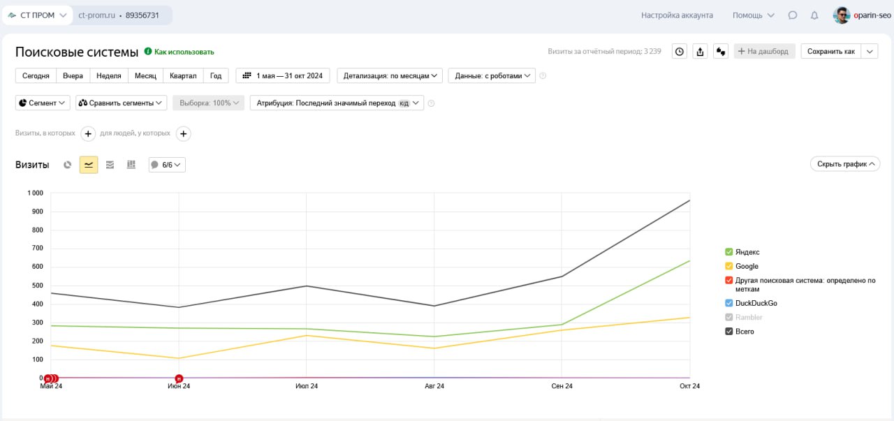 Реальный кейс по SEO-продвижению интернет-магазина ct-prom.ru, специализирующегося на оптовых продажах упаковки и хозтоваров. Проект, с которым начали работы в июле, столкнулся с рядом серьезных проблем, препятствующих эффективному ранжированию в поисковых системах. Однако благодаря комплексному подходу и грамотной оптимизации нам удалось добиться впечатляющих результатов - рост органического трафика превысил 200 всего за 4 месяца работы.