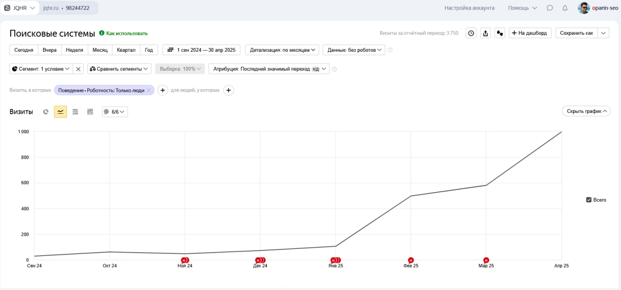 На момент начала работы с проектом в декабре 2024 года, сайт не приносил должного органического трафика. Главная цель SEO-работы заключалась в увеличении видимости сайта в поисковых системах, что должно было привести к росту органических переходов и конверсии. Компания искала способы вывести сайт на новый уровень, сделать его конкурентоспособным в своей нише и привлечь больше целевой аудитории