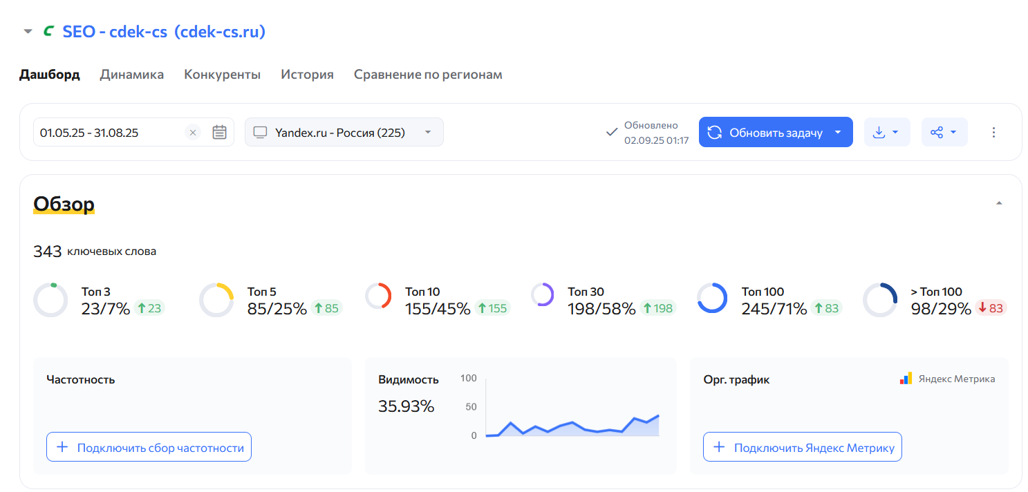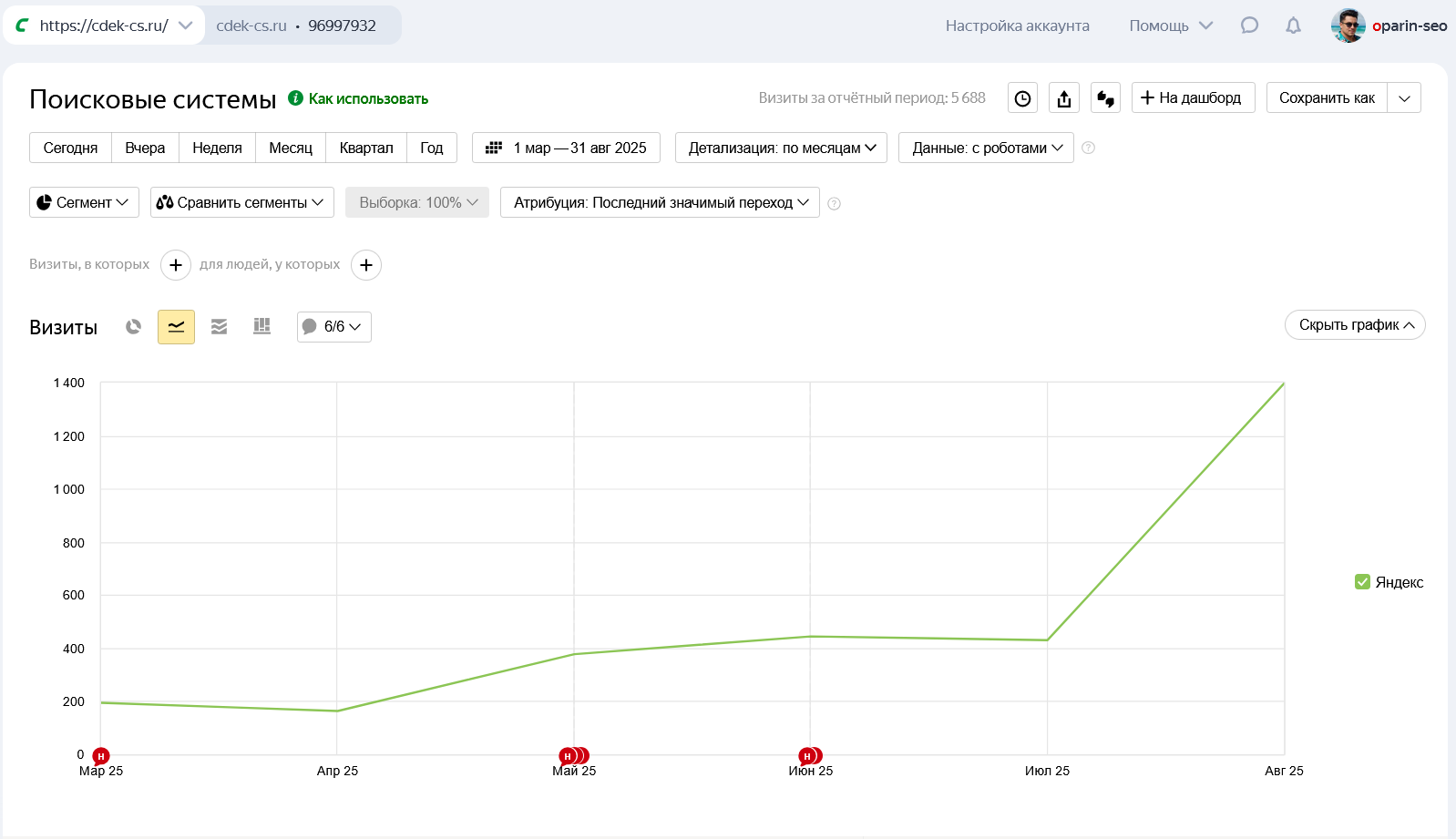 Проект cdek-cs.ru сайт, который помогает частным лицам и бизнесу отправлять и получать посылки через СДЭК (CDEK). Когда мы подключились, ресурс почти не был заметен в поиске: минимальный органический трафик, узкая структура и ощущение лендинга с калькулятором, а не живого сервиса. Наша цель была очевидна: превратить сайт из короткой визитки в полноценный коммерческий ресурс, закрывающий реальный спрос и растущий из поиска.