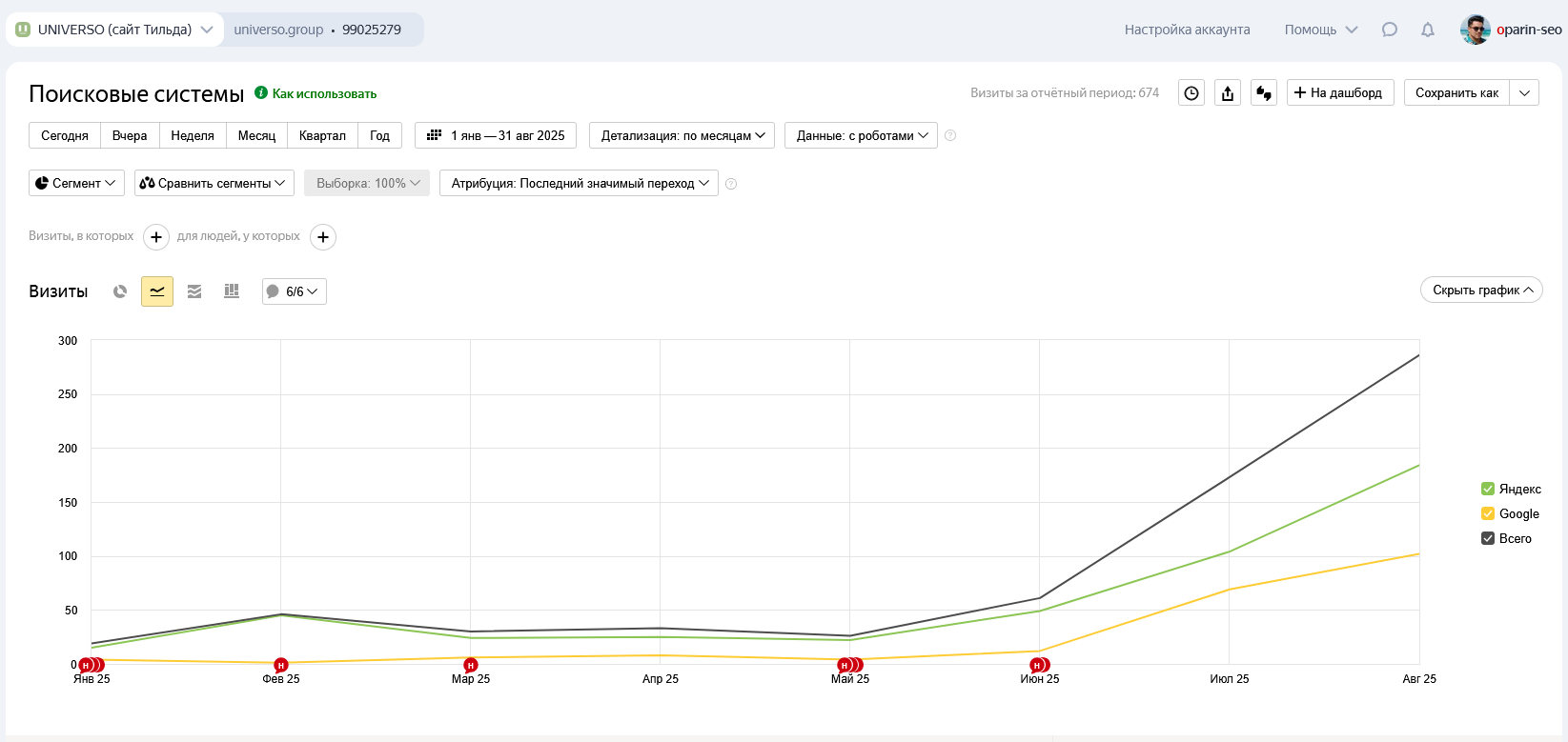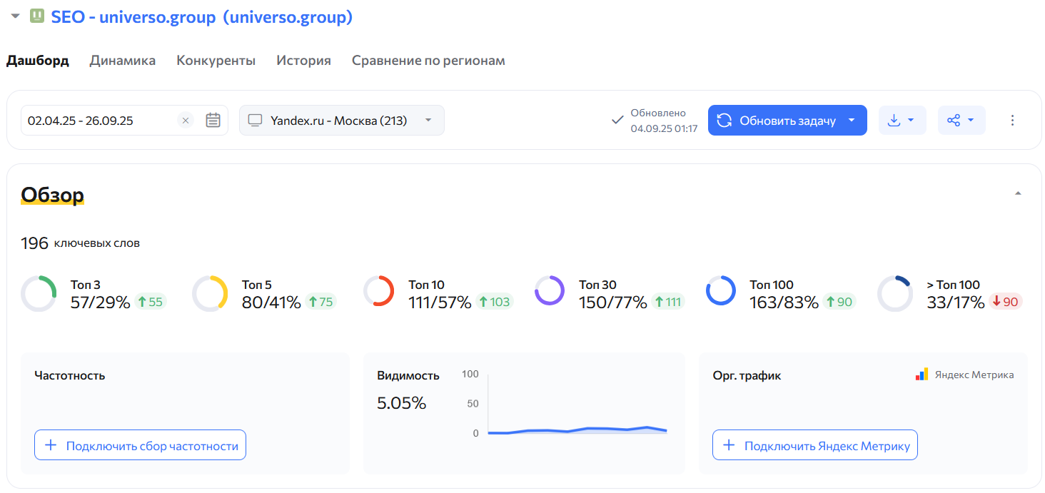 Когда сайт Universo.group пришел в работу в мае 2025 года, он представлял собой фактически лендинг с одной страницей. Это означало, что сайт был практически не подготовлен для полноценного SEO-продвижения. На сайте не было ни внутренних страниц с товарами, ни раздела для блога, ни даже страниц с базовой информацией, которая могла бы раскрыть поисковым системам ключевые аспекты деятельности компании.
