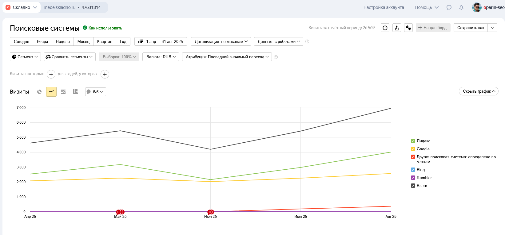 Сайт MebelSkladno.ru - интернет-магазин мебели, работающий в Санкт-Петербурге. Клиент обратился с задачей улучшить SEO-позиции и увеличить органический трафик, поскольку трафик из поисковых систем был недостаточным для получения необходимого числа заказов. Основная цель заключалась в оптимизации страниц сайта, устранении проблем с ранжированием, а также в усилении видимости каталога продукции.