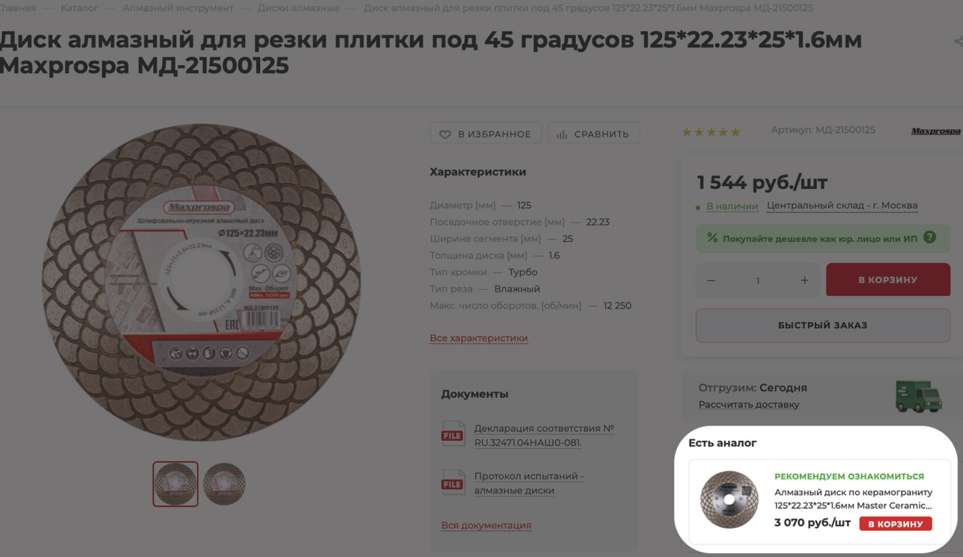 2. Переработали карточку товара: вывели документацию в карточку к каждому товару, добавили блок с аналогами, доработали конверсионный блок.