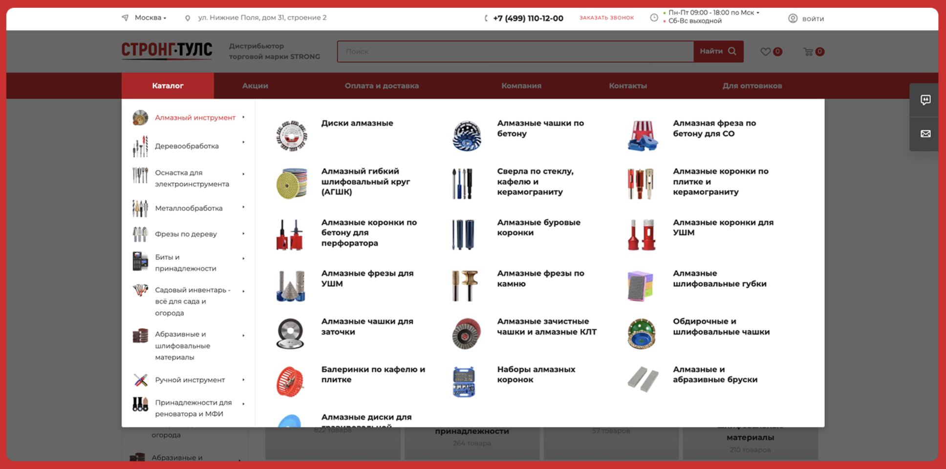 Наш клиент компания СТРОНГ.ТУЛС, работающая в сфере строительных инструментов. У клиента уже был сайт на решении Аспро: Максимум, но функционально он не решал ряд бизнес-задач и требовал доработок под реальные сценарии покупателей. Клиенту важно было получить сайт, который будет экономить время покупателей на поиск товаров и важной информации.