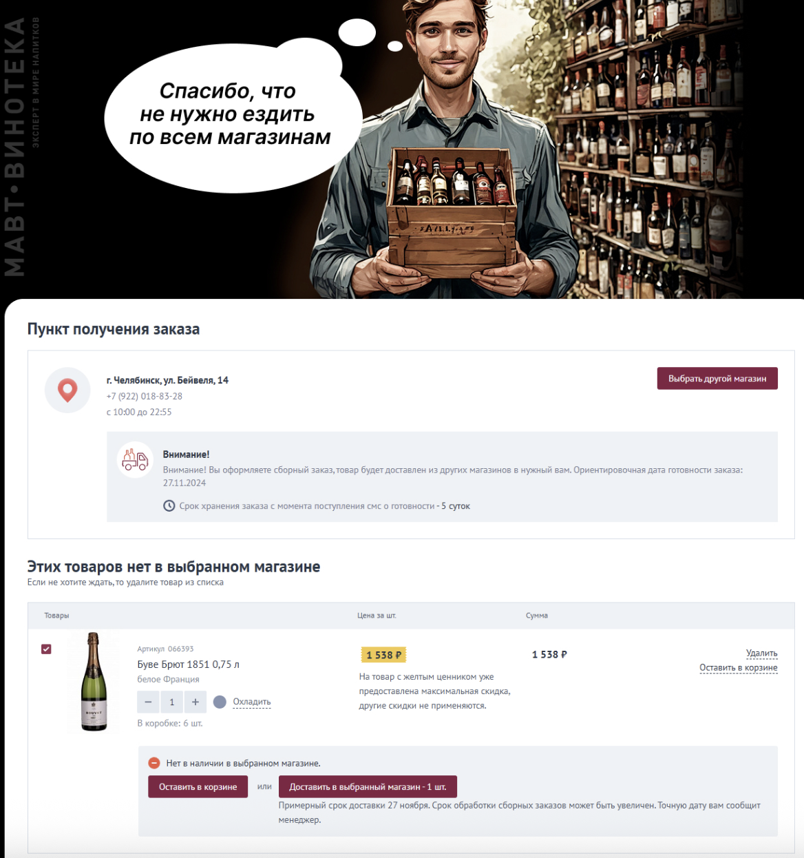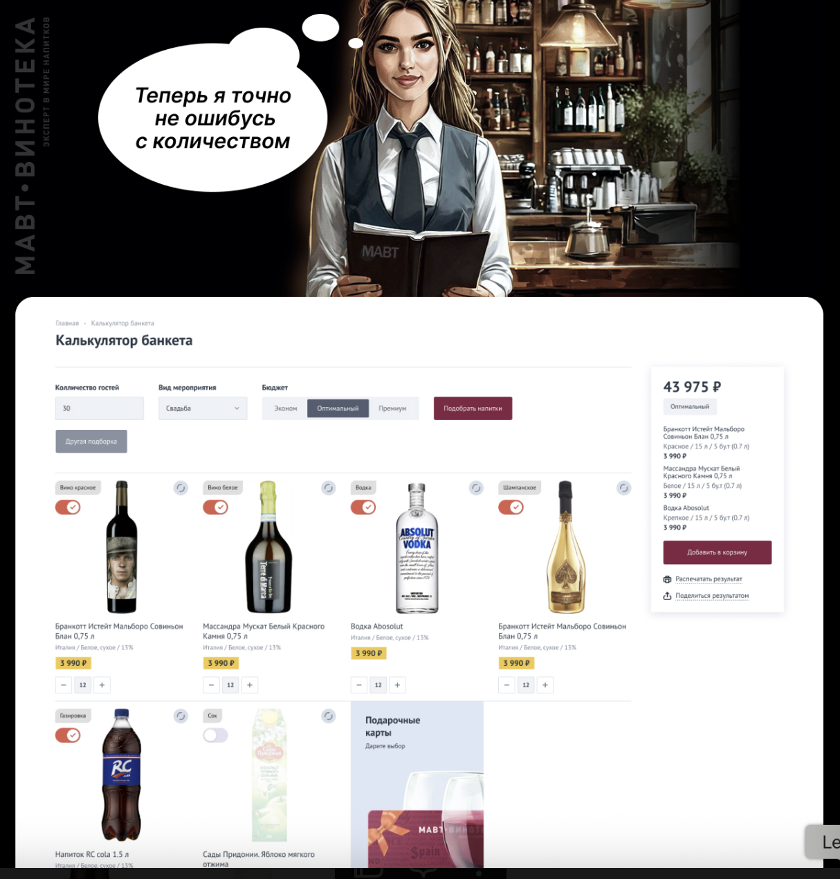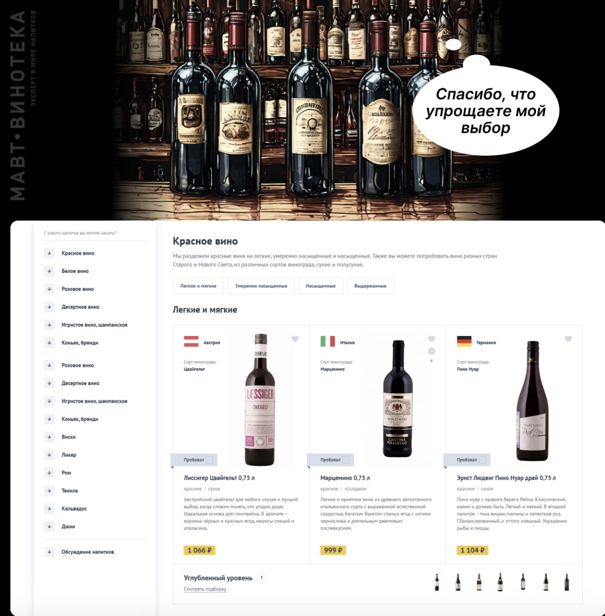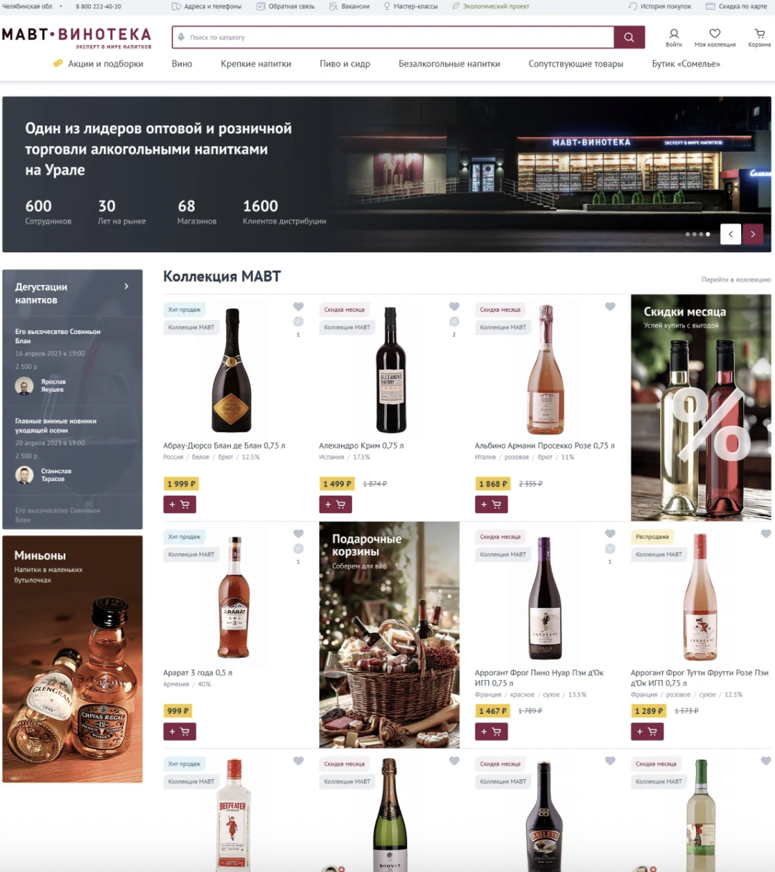 Проект МАВТ-Винотека развивается с начала 2000-х годов, поэтому одной из ключевых задач стал комплексный редизайн сайта с учётом современных UX-подходов и бренд-стандартов компании. Работы начались с аналитики и изучения конкурентов, затем были разработаны прототипы, выполнена вёрстка и аккуратное внедрение нового дизайна на платформе 1С-Битрикс без остановки работы сайта.