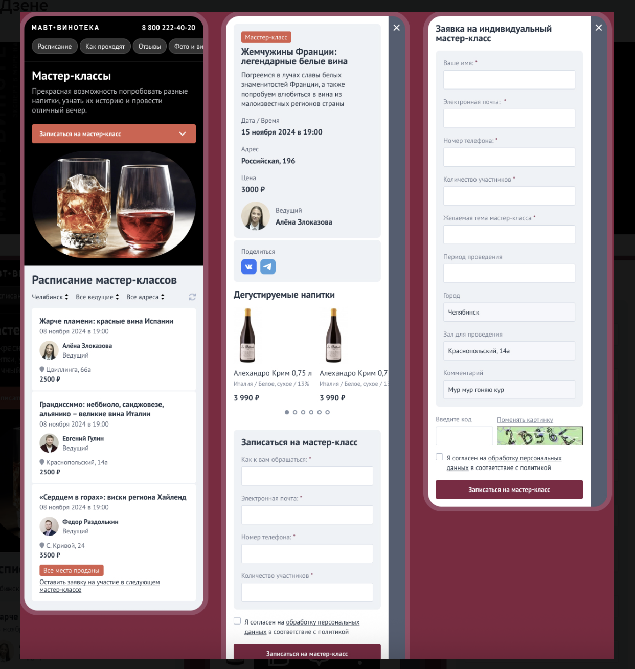 Для мероприятий и дегустаций был создан отдельный раздел с онлайн-регистрацией и автоматическим учётом мест. Дополнительно разработан функционал фиксации продегустированных напитков через QR-код пользователи видят их в личном кабинете и могут оформить заказ позже.