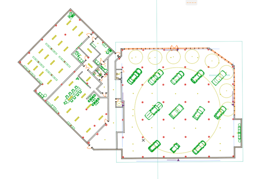 Перепланировка существующего автосалона. Зонирование с учетом колонн, расстановка перегородок, планировка.