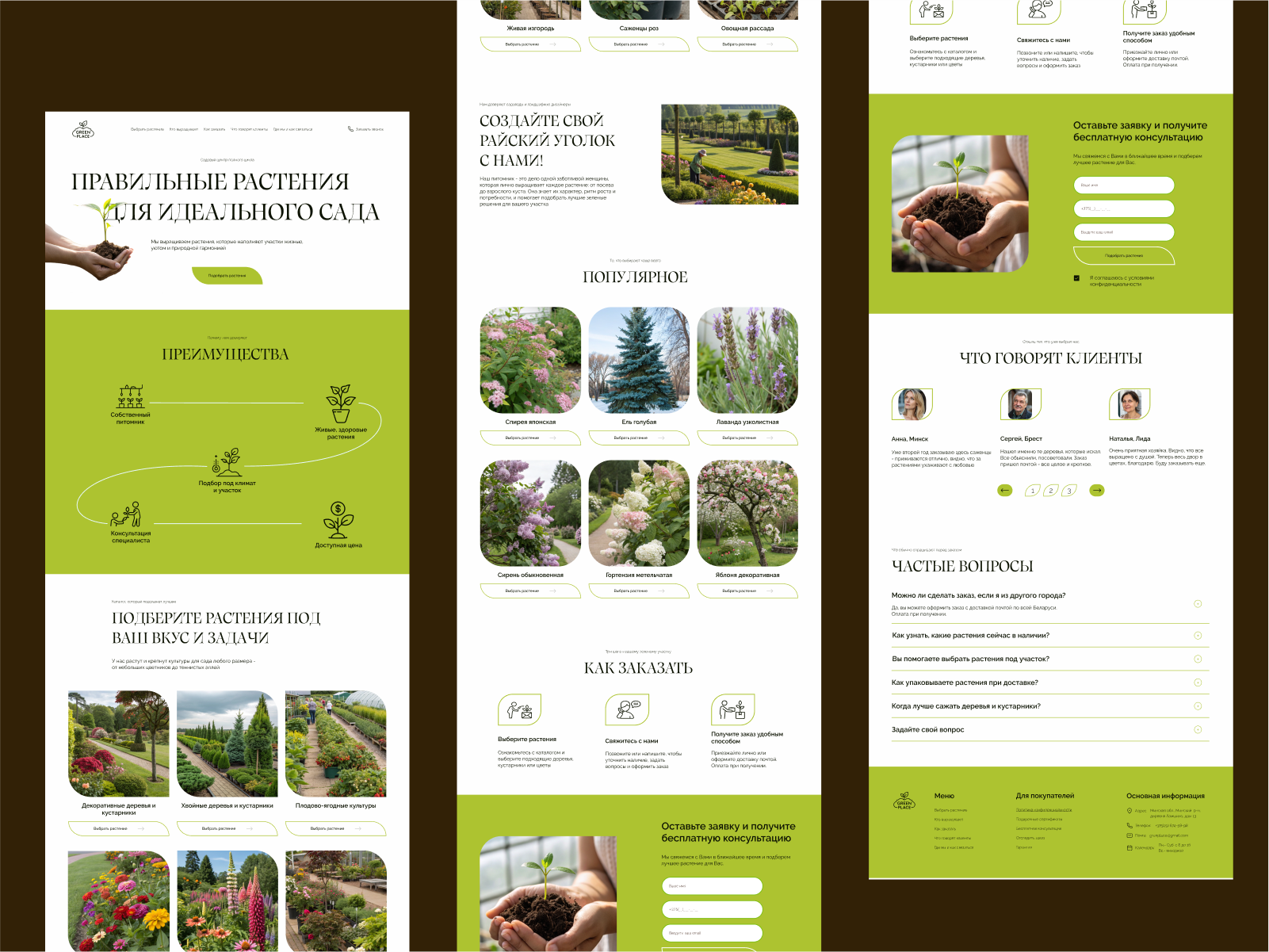 Дизайн одностраничного сайта с акцентом на простоту и чистоту восприятия. Основной фон белый, что подчеркивает свежесть и легкость, а зеленые акценты визуально ассоциируются с природой и растениями. В лендинге продумала структуру блоков, выделила ключевые предложения и настроила гармоничное сочетание типографики и визуальных деталей.