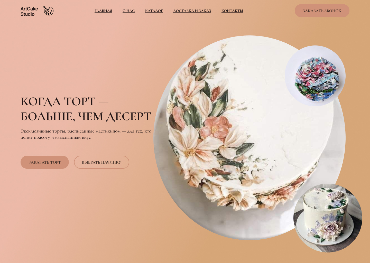 Это учебная работа. Элегантный и художественный дизайн главной страницы для кондитерской, занимающейся росписью тортов мастихином.
