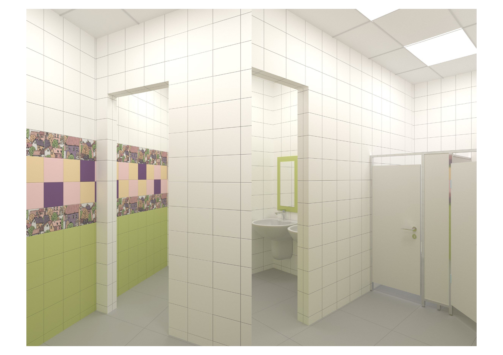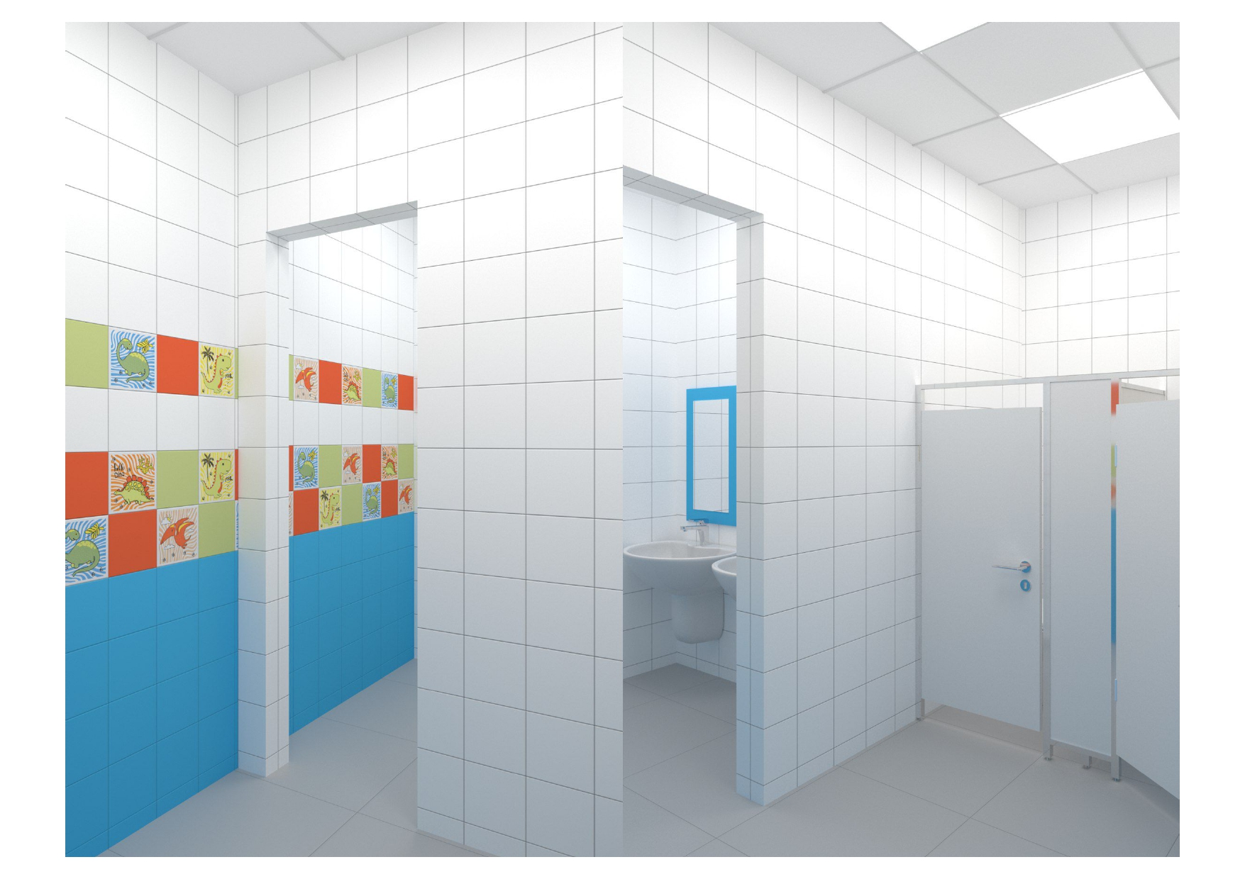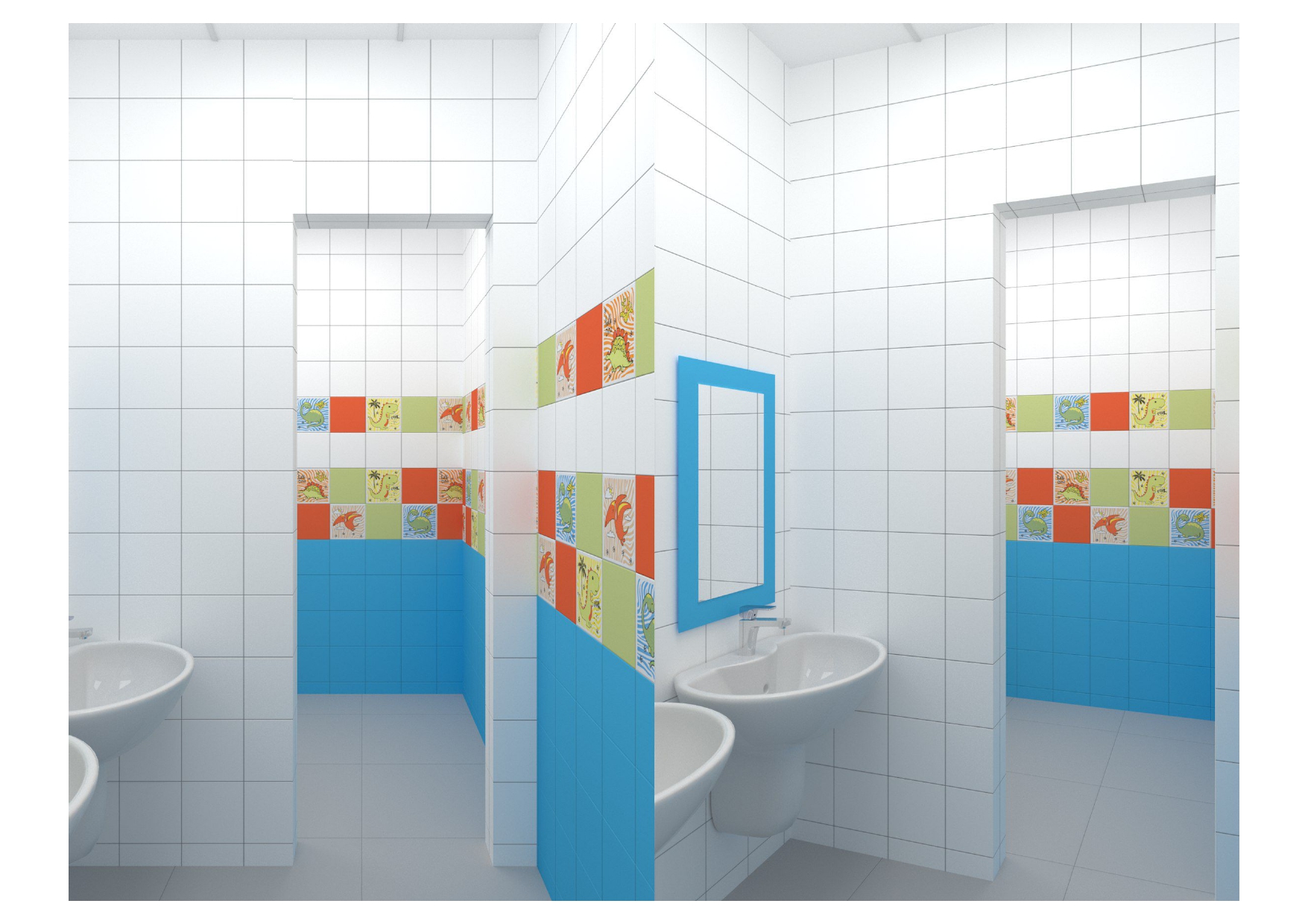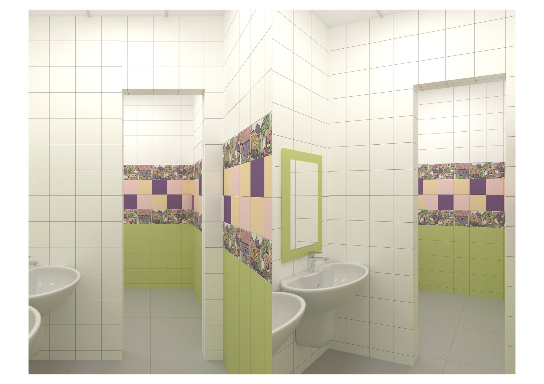 проект для лицея, нужно было разработать дизайн - проект для санузлов в блоке начальных классов, очень маленький бюджет, из инструментов - цвет плитки и возможность покрасить раму у зеркала