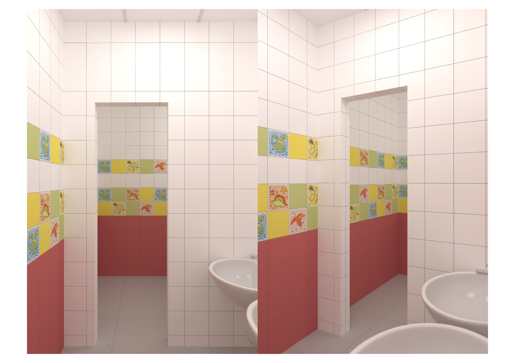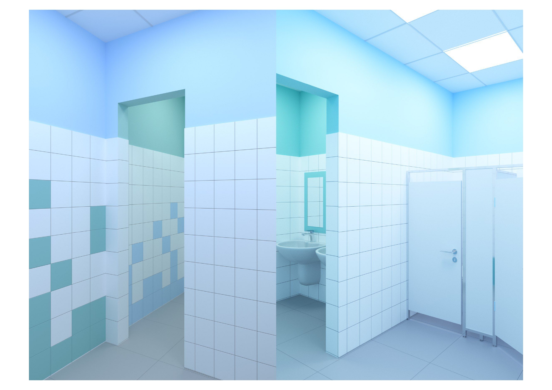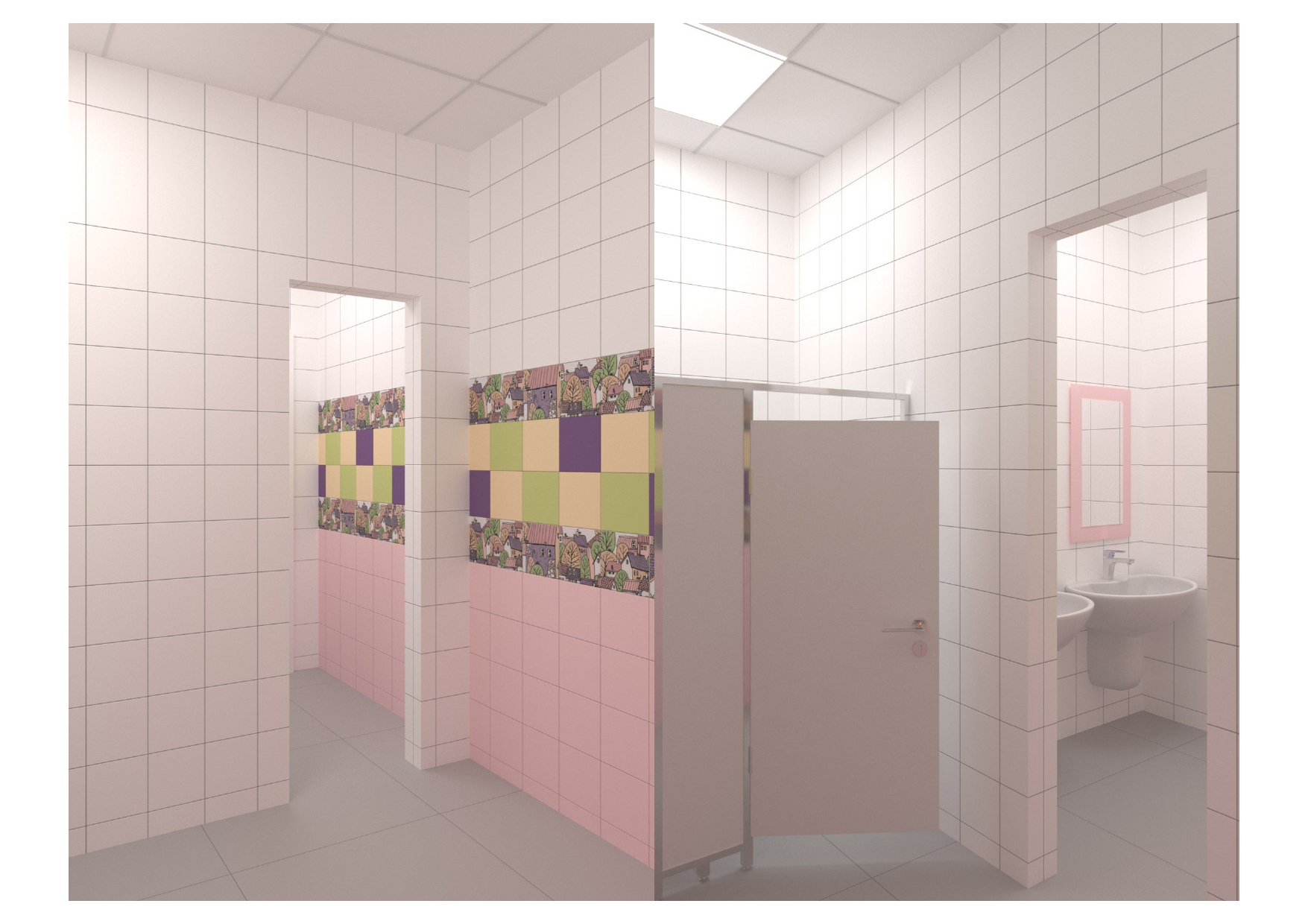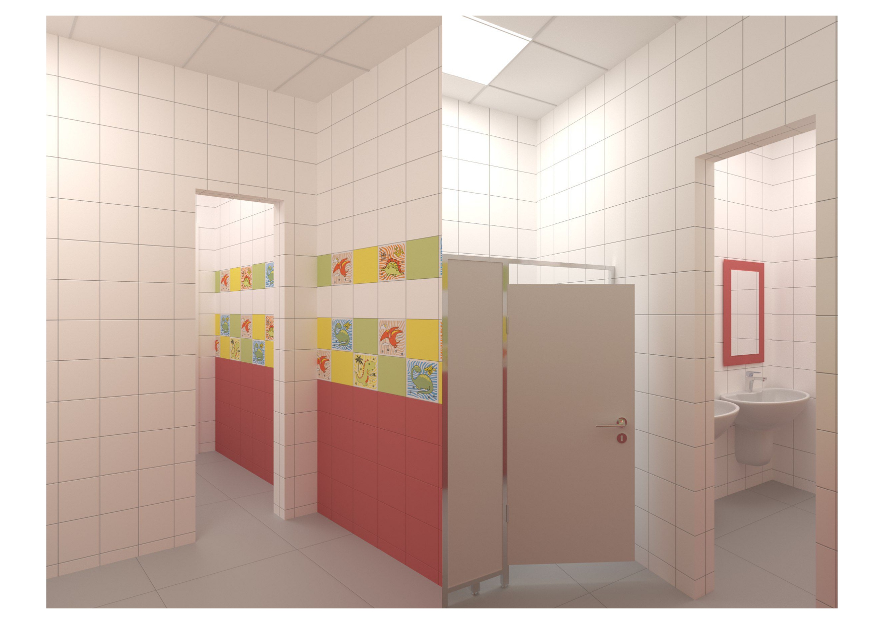 проект для лицея, нужно было разработать дизайн - проект для санузлов в блоке начальных классов, очень маленький бюджет, из инструментов - цвет плитки и возможность покрасить раму у зеркала