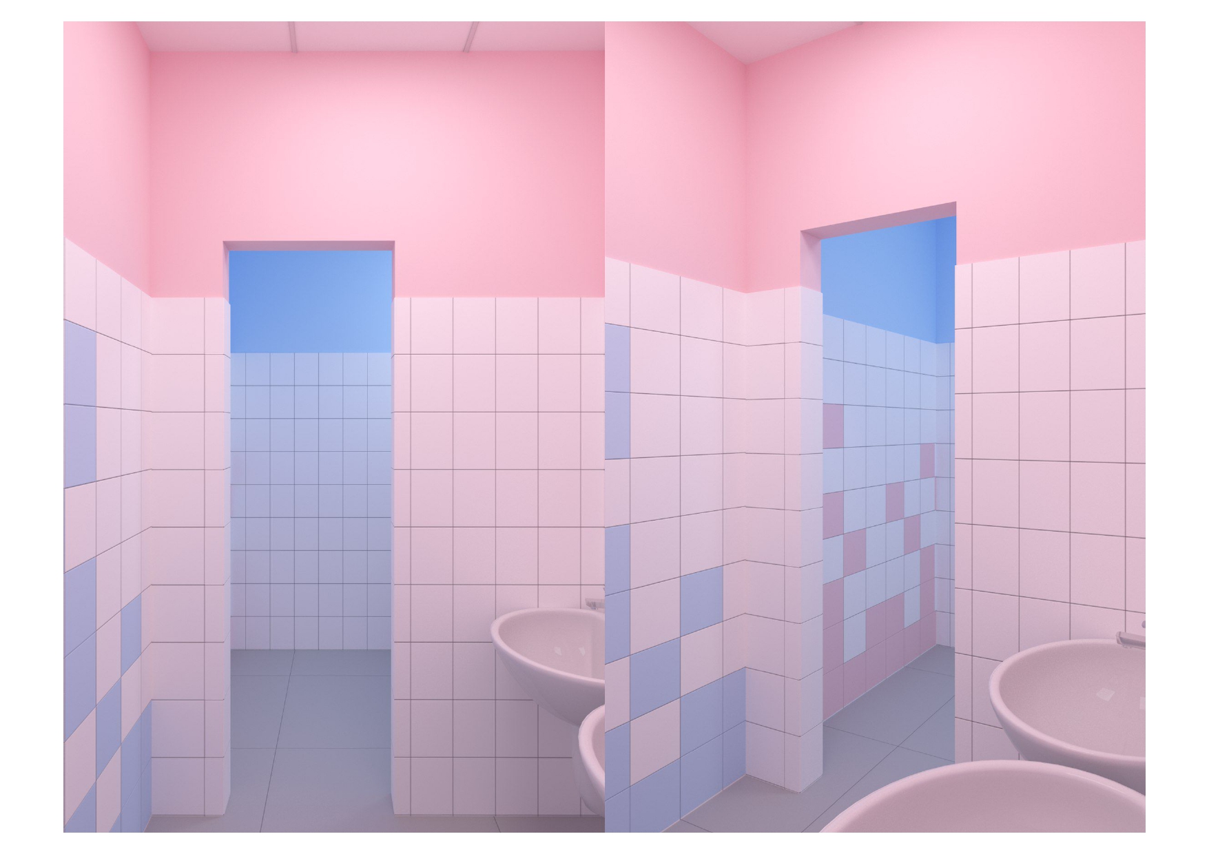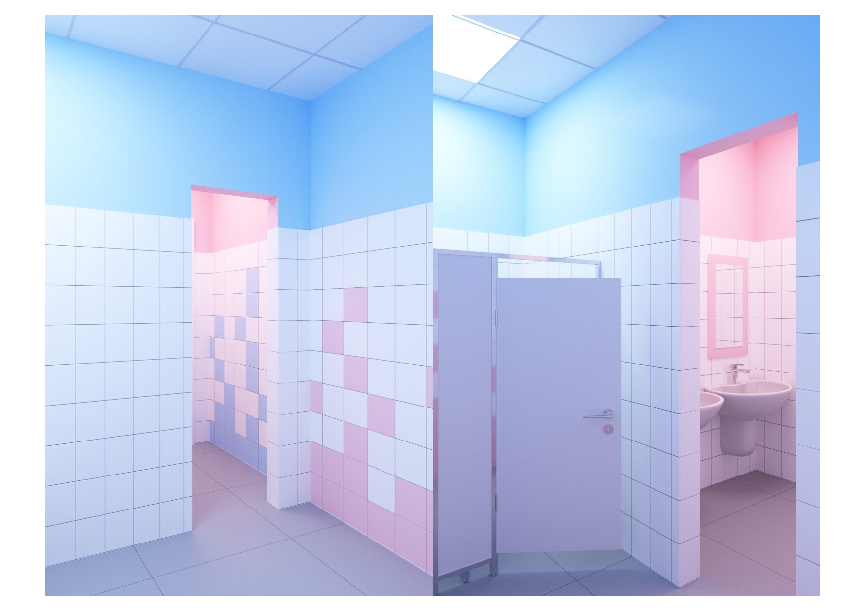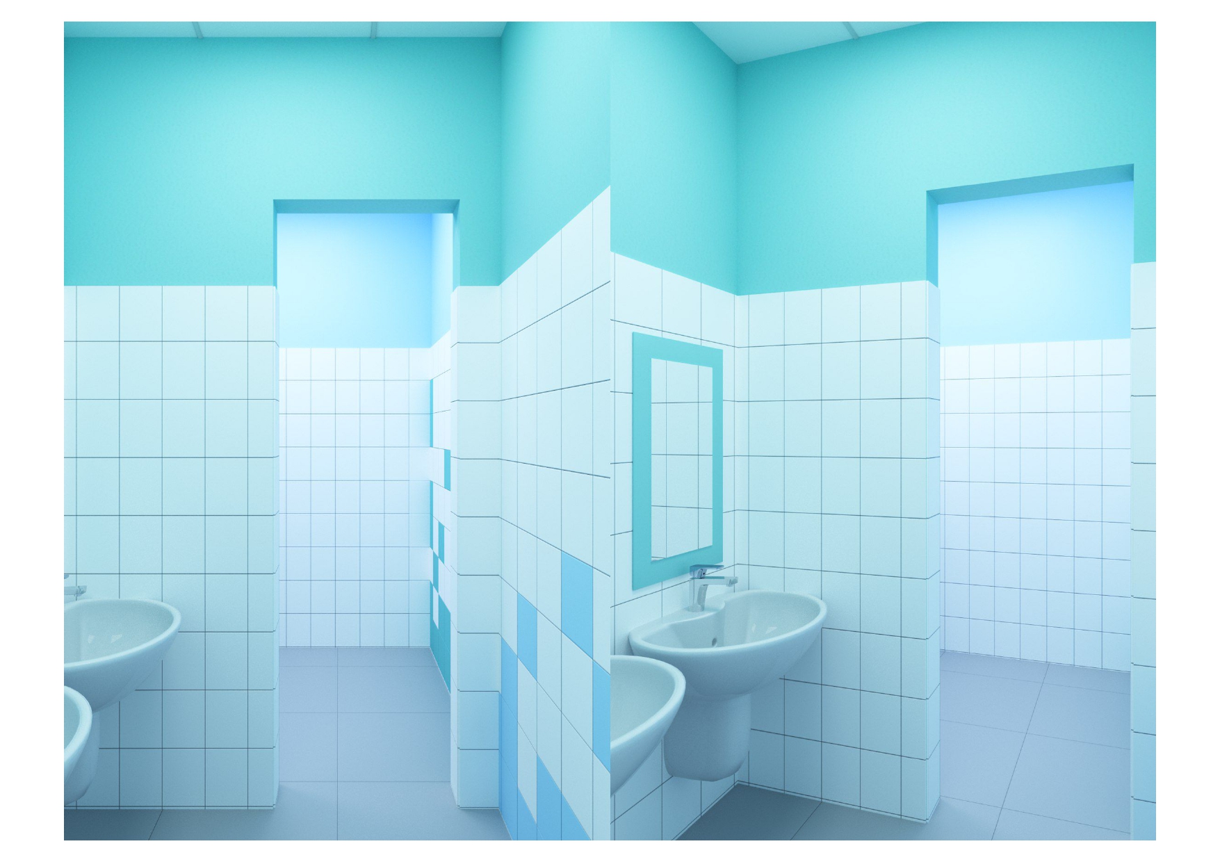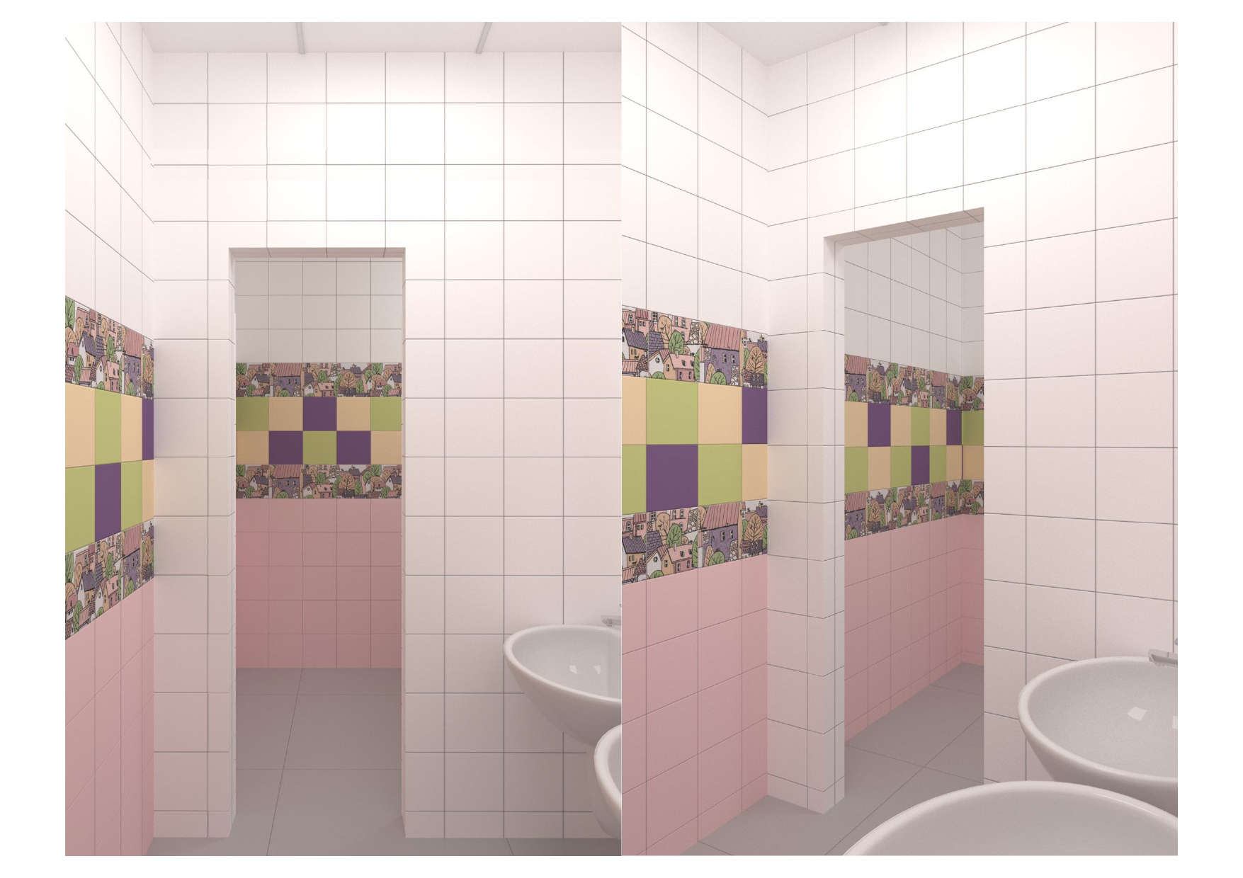 проект для лицея, нужно было разработать дизайн - проект для санузлов в блоке начальных классов, очень маленький бюджет, из инструментов - цвет плитки и возможность покрасить раму у зеркала