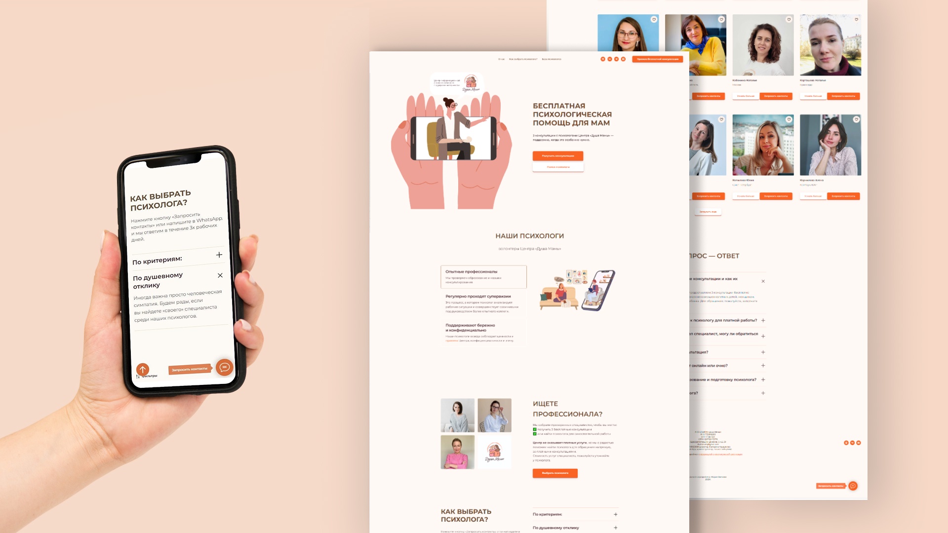 Разработка одностраничного сайта, который позволял бы мамам быстро подбирать себе психолога для бесплатных консультаций или получать актуальные контакты психолога для самостоятельной платной работы.