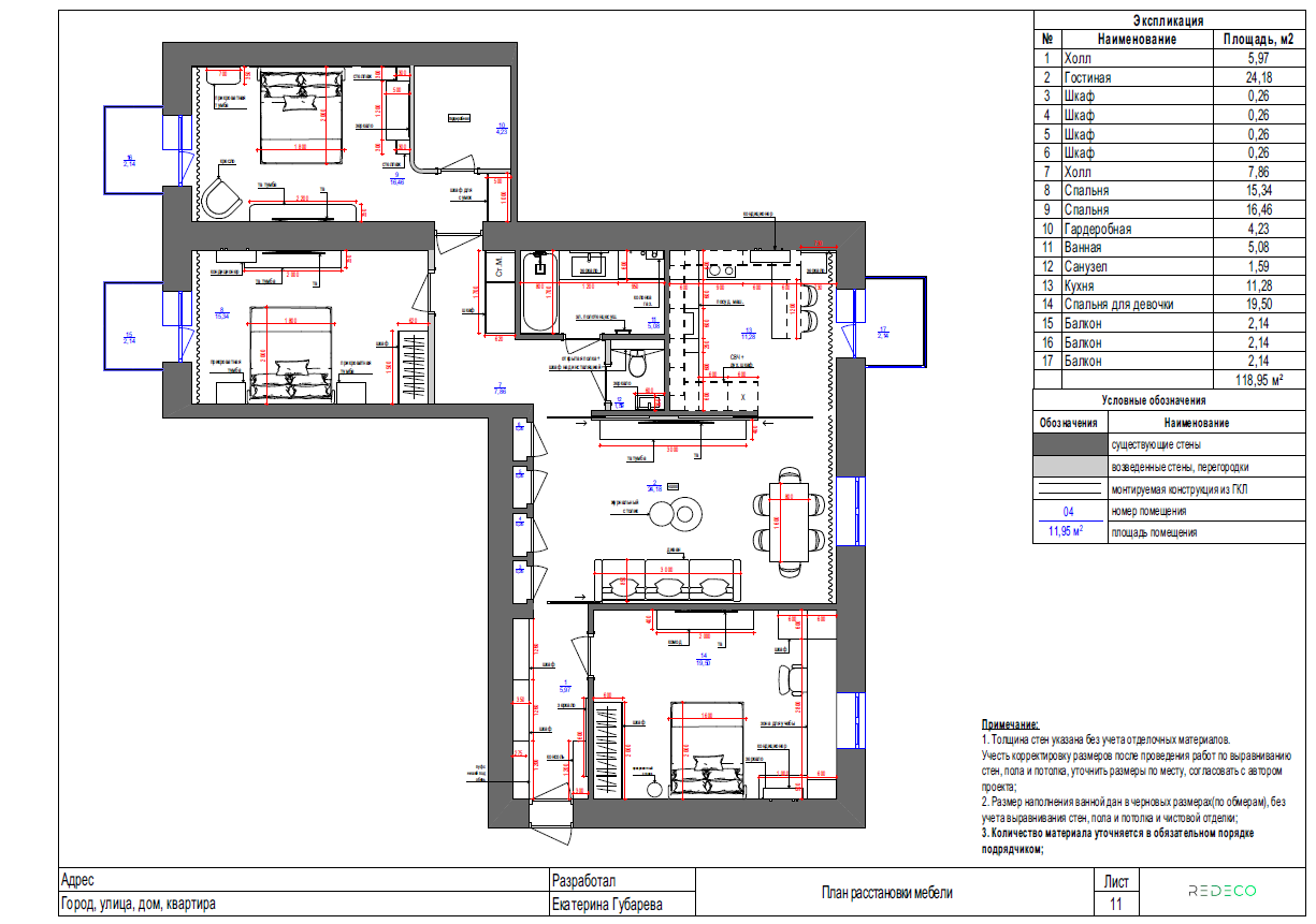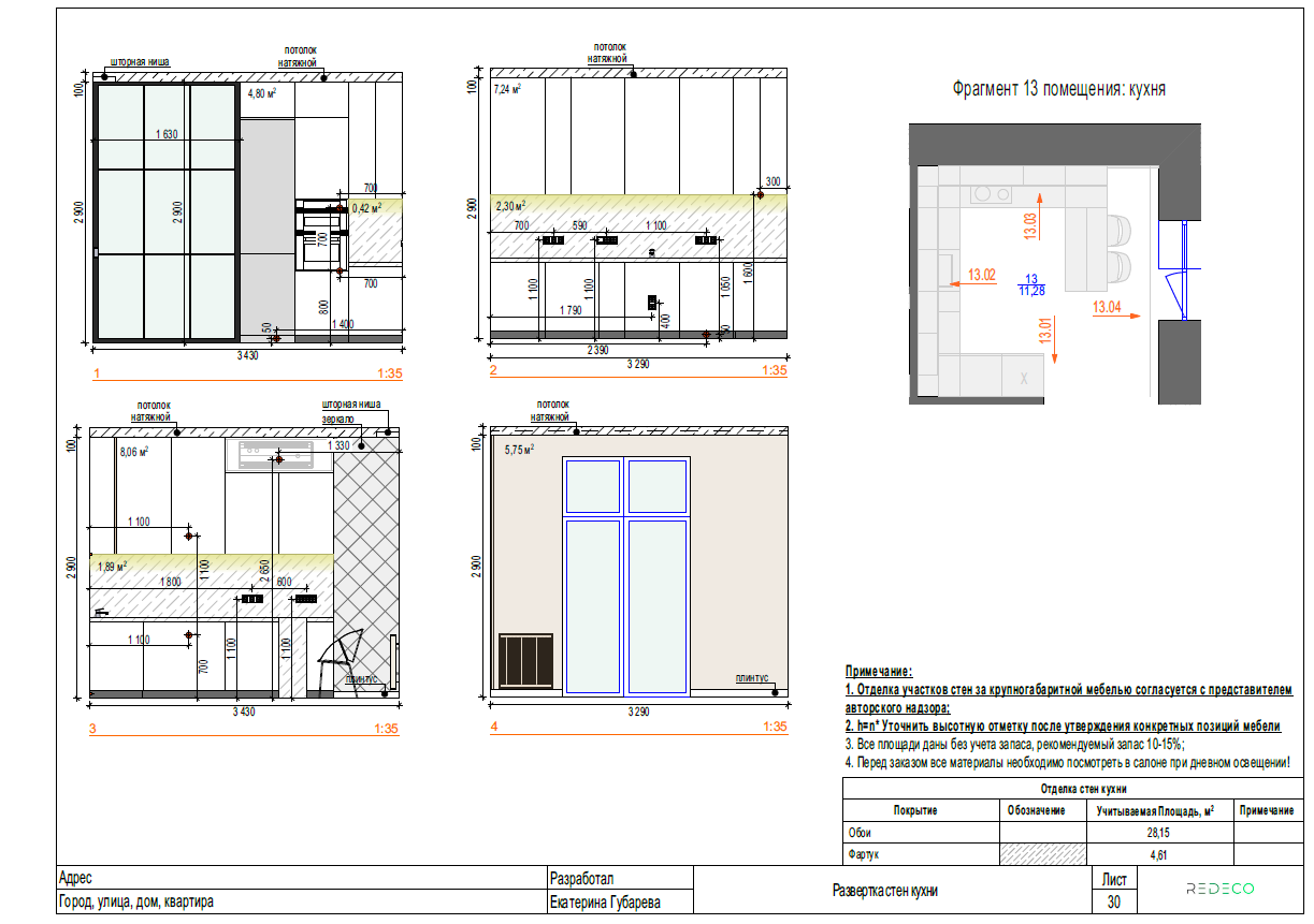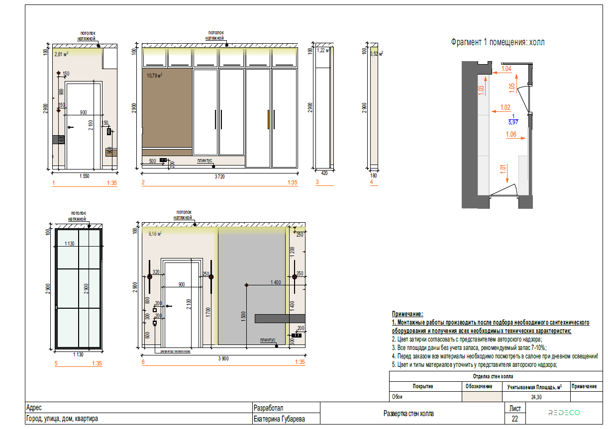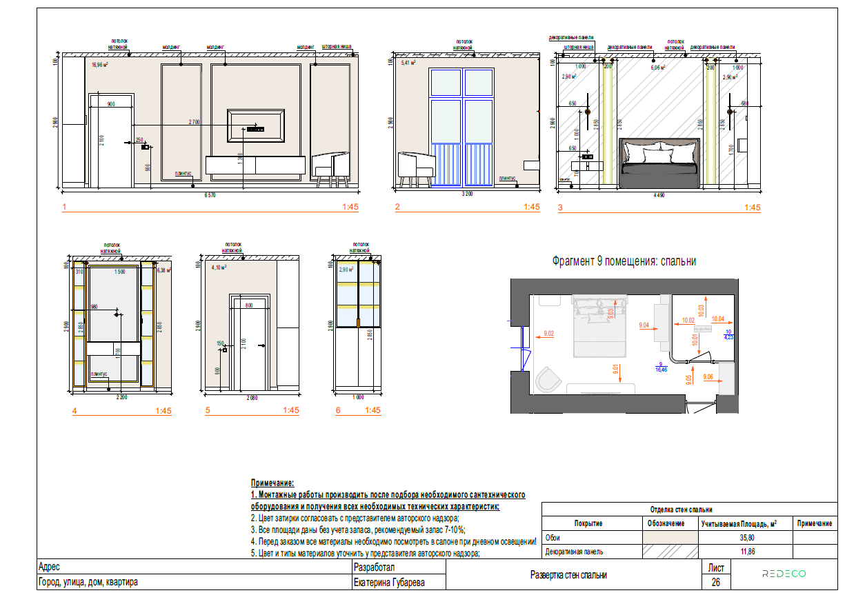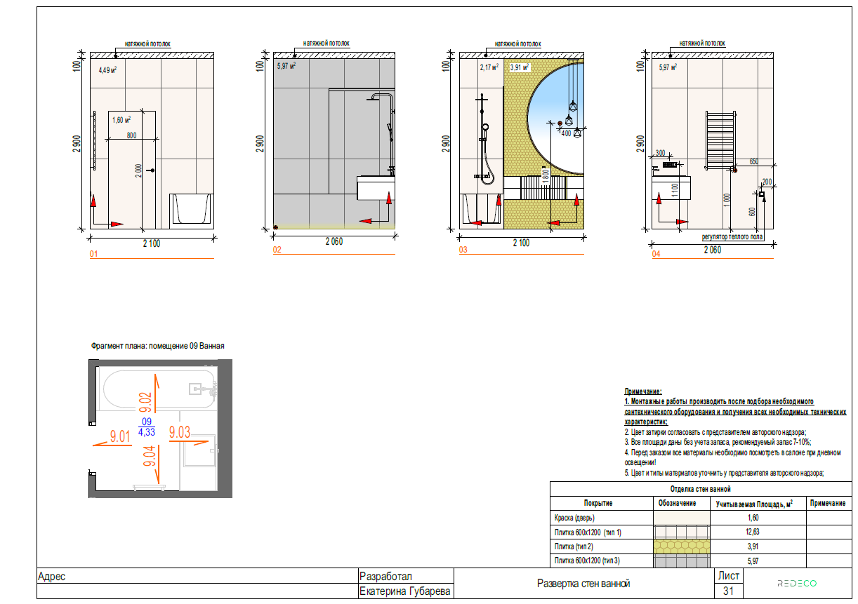 Работа полностью удаленно. Присылают замер кв . визуализацию и далее приступаю к чертежам. Разрабатывала проектную документацию дизайн-проекта: план обмеров, план демонтажа перегородок, план возводимых перегородок, план маркировки дверей, план напольных покрытий, план плинтусов, план расстановки мебели, план привязки светильников, спецификация светильников, план привязки выключателей, план розеток, спецификация розеток и выключателей, план потолков, план привязки сантехнического оборудования, план теплых полов, развертки стен.